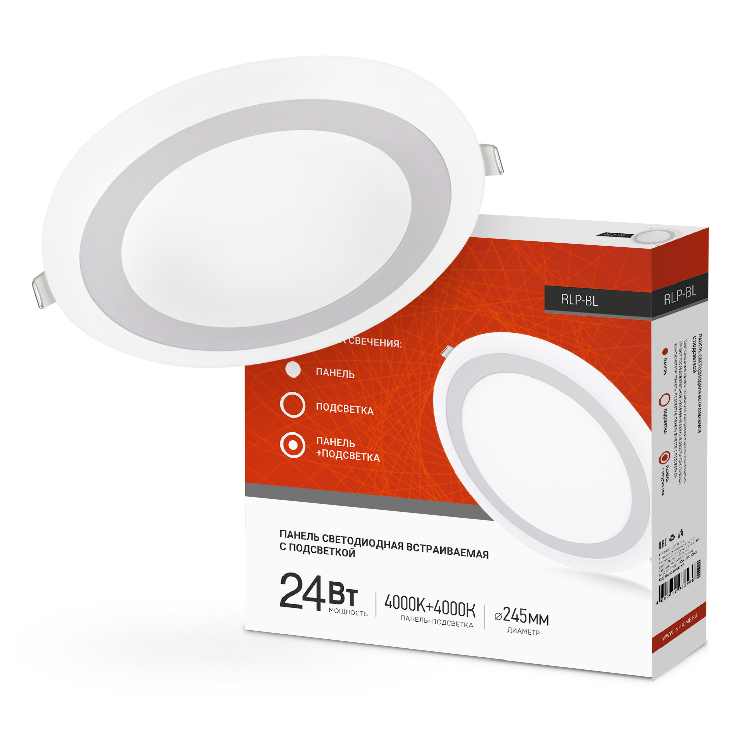 Ультратонкие встраиваемые потолочные панели RLP-BL от IN HOME с тремя режимами работы подходят как для общего освещения, так и для точечной подсветки помещений. В зависимости от необходимости вы можете включать отдельно: основной свет (центральная панель), подсветку (кольцо по периметру), либо основной свет и подсветку одновременно. Это позволит не только регулировать степень освещенности помещения, но и оптимизировать расходы на электроэнергию. Панели RLP-BL обеспечивают яркий равномерный свет с коэффициентом пульсации менее 5%, который не вызывает усталости глаз и соответствует всем нормам СанПиН по качеству освещения. Корпус изготовлен из высококачественного негорючего пластика. ЭПРА поставляется в комплекте. Панель RLP-BL может устанавливаться практически на любом виде поверхности, включая натяжные потолки, так как он не нагревается даже при длительном использовании. Светильник экологически безопасен и не требует специальной утилизации.