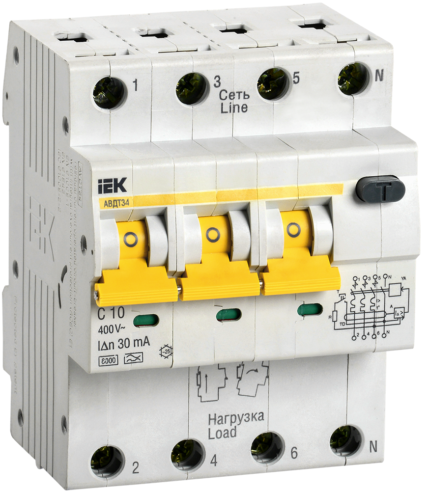 АВДТ34 выпускаются в четырехполюсном исполнении на номинальные токи 6, 10, 16, 20, 25, 32, 40, 50, 63 А и номинальные отключающие дифференциальные токи 10, 30, 100, 300 мА.