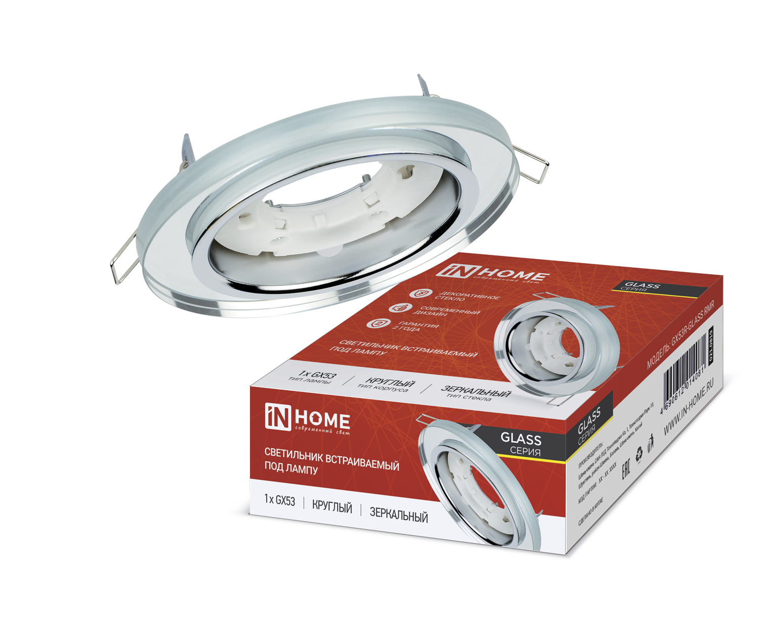 Круглый встраиваемый светильник IN HOME серии GX53R-RMR-glass под лампу GX53 предназначен для эксплуатации в сетях переменного тока 230 В. Может работать со светодиодными лампами GX53 мощностью от 2 Вт до 13 Вт с цветовой температурой от 2700 К до 6400 К. Представляет собой отличную замену точечным светильникам под зеркальные и галогенные лампы рефлекторного типа. Экономит до 50% электроэнергии. Модель проста в монтаже, идеально подходит для установки в подвесные и натяжные потолки. Может использоваться для освещения жилых и общественных помещений, офисных зданий, торговых комплексов, кафе, ресторанов и т.д. Подходит для основных и вспомогательных мест общего пользования (коридоры, лестничные пролеты, столовые, конференц-залы, спортзалы и др.). Линейка встраиваемых светильников GX53R-glass представлена в двух вариантах декоративного исполнения - зеркальном и матовом стекле. Гарантия 2 года.