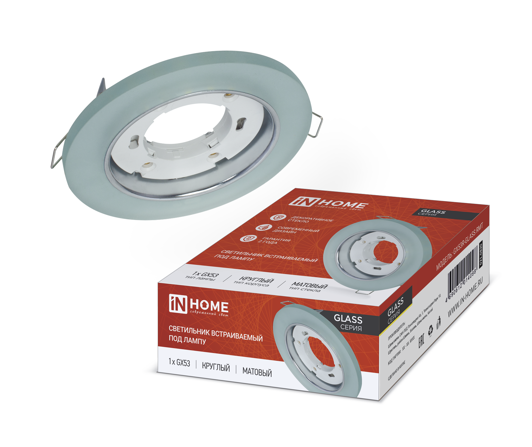 Круглый встраиваемый светильник IN HOME серии GX53R-RMT-glass под лампу GX53 предназначен для эксплуатации в сетях переменного тока 230 В. Может работать со светодиодными лампами GX53 мощностью от 2 Вт до 13 Вт с цветовой температурой от 2700 К до 6400 К. Представляет собой отличную замену точечным светильникам под зеркальные и галогенные лампы рефлекторного типа. Экономит до 50% электроэнергии. Модель проста в монтаже, идеально подходит для установки в подвесные и натяжные потолки. Может использоваться для освещения жилых и общественных помещений, офисных зданий, торговых комплексов, кафе, ресторанов и т.д. Подходит для основных и вспомогательных мест общего пользования (коридоры, лестничные пролеты, столовые, конференц-залы, спортзалы и др.). Линейка встраиваемых светильников GX53R-glass представлена в двух вариантах декоративного исполнения - зеркальном и матовом стекле. Гарантия 2 года.